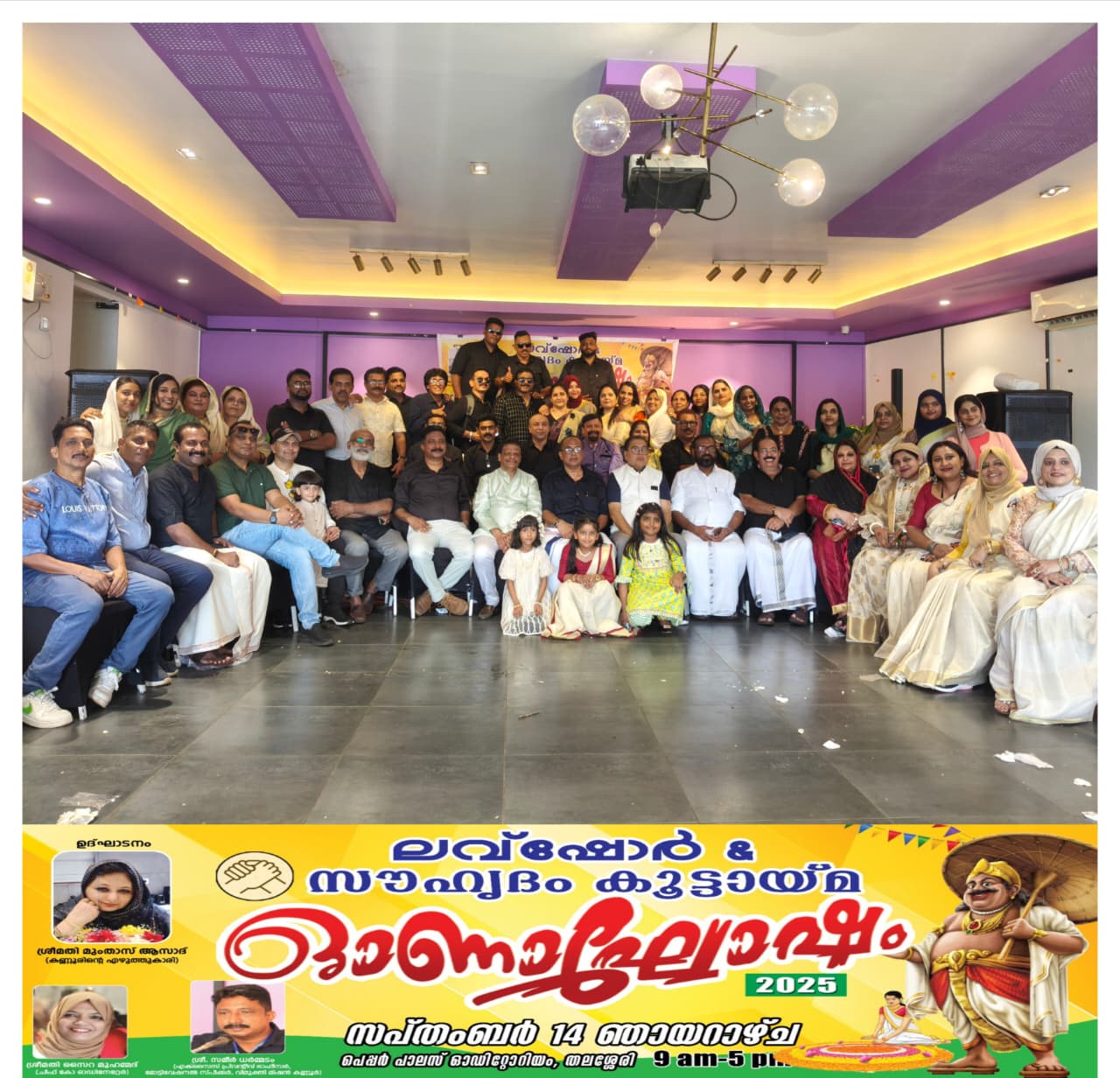 കേരള സൗഹ്യദം കൂട്ടായ്മയും ലവ്ഷോർ കൂട്ടായ്മയും സംയുക്തമായി തലശ്ശേരി പെപ്പർ പാലസിൽ വെച്ച് ഓണാഘോഷം സംഘടിപ്പിച്ചു. പ്രശസ്ത എഴുത്തുകാരി ശ്രീമതി മുംതാസ് ആസാദ് പരിപാടി ഉദ്ഘാടനം നിർവ്വഹിച്ചു. അഡ്വ: ഷബീർ കെ.സി. ഓണസന്ദേശം നൽകി. സൈറ മുഹമ്മദ്, സമീർ ധർമ്മടം , സുലൈഖ ടീച്ചർ, നജീബ് മാമാസ്, റഷീദ് കരിയാടൻ, ഡോ:അബദുൾ സലാം, ജാസ് ജാഫർ, സിറാജ് മാഹി, ഉസ്മാൻ വടക്കുമ്പാട് ,ജെസി രാഘേഷ്, കബീർ, തുടങ്ങിയവർ സംസാരിച്ചു.