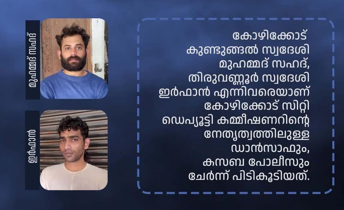 നിരോധിത മാരക മയക്കുമരുന്നുകളുമായി കോഴിക്കോട് തിരുവണ്ണൂർ നടയിൽ ഇർഫാൻസ് ഹൗസിൽ മുഹമ്മദ് ഇർഫാൻ (29 വയസ്), കുണ്ടുങ്ങൽ എംസി ഹൗസിൽ ഷഹദ് (27 വയസ്) എന്നിവരെയാണ് കോഴിക്കോട് സിറ്റി ഡെപ്യൂട്ടി പോലീസ് കമ്മീഷണർ അരുൺ കെ പവിത്രന്‍ ഐ.പി.എസിന്‍റെ നിർദ്ദേശപ്രകാരം നർക്കോട്ടിക്ക് സെൽ അസിസ്റ്റൻ്റ് കമ്മീഷണർ എ.ജെ ജോർജിൻ്റെ നേതൃത്വത്തിലുള്ള സിറ്റി ഡാൻസാഫും സബ് ഇൻസ്പെക്ടർ സനീഷിൻ്റെ നേതൃത്വത്തിലുള്ള കസബ പോലീസും ചേർന്ന് പിടികൂടിയത്.