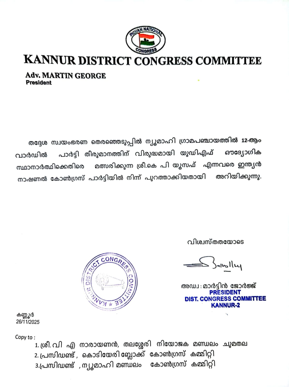 ന്യൂമാഹി: ന്യൂമാഹി ഗ്രാമപഞ്ചായത്തിൽ 12-ാം വാർഡ് അഴീക്കലിൽ പാർട്ടി തീരുമാനത്തിന് വിരുദ്ധമായി മത്സരിക്കുന്ന കിടാരൻകുന്നിലെ കെ.പി. യൂസഫിനെ കോൺഗ്രസ് പാർട്ടിയിൽ നിന്നും പുറത്താക്കിയതായി ജില്ലാ പ്രസിഡൻ്റ്‌ അഡ്വ. മാർട്ടിൻ ജോർജ് അറിയിച്ചു.