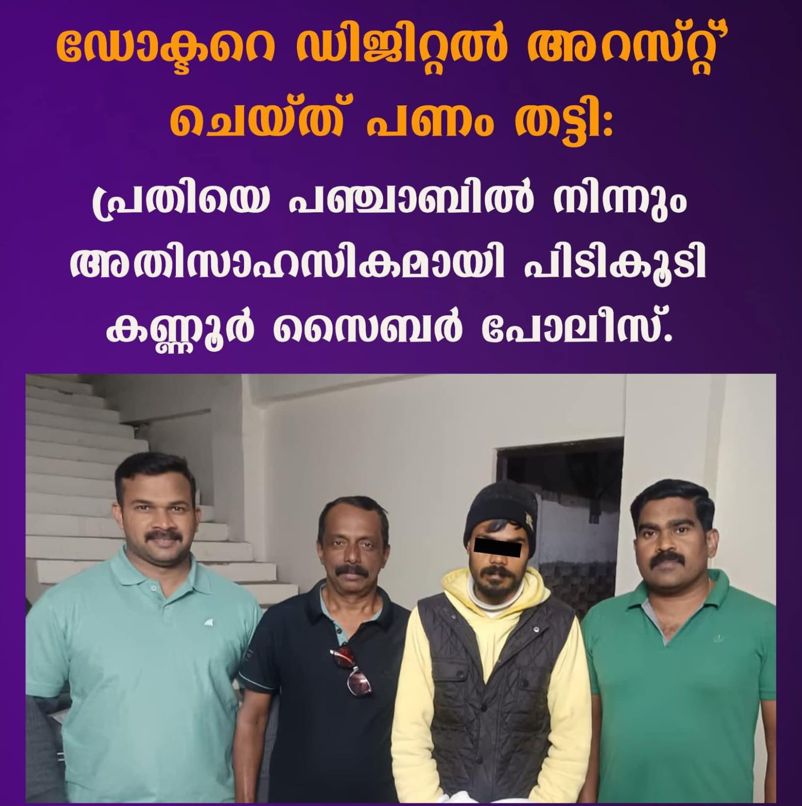 ഡോക്ടറെ ‘ഡിജിറ്റൽ അറസ്റ്റ്’ ചെയ്ത് പണം തട്ടി: പ്രതിയെ പഞ്ചാബിൽ നിന്നും അതിസാഹസികമായി പിടികൂടി കണ്ണൂർ സൈബർ പോലീസ്.