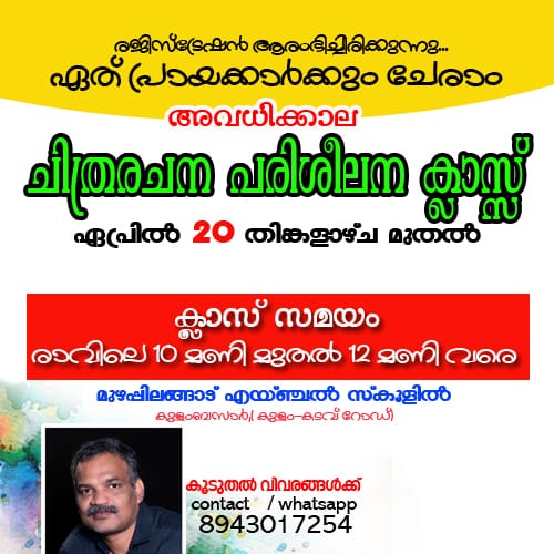 ചിത്രകലയുടെ അടിസ്ഥാന പാഠങ്ങൾ ഉൾപ്പെടുത്തിക്കൊണ്ട്, ചിത്രകലയിൽ അഭിരുചിയുള്ളവർക്കായി 2026 ഏപ്രിൽ 20 മുതൽ മുഴപ്പിലങ്ങാട് എയ്ഞ്ചൽ സ്കൂളിൽ വച്ച് ചിത്രരചനാ ക്ലാസ് നടത്തുകയാണ്.